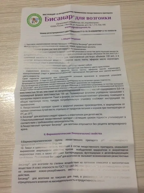 Мед, от пчелосемей, обработанных препаратом Бисанар для возгонки, используют на общих основаниях.
