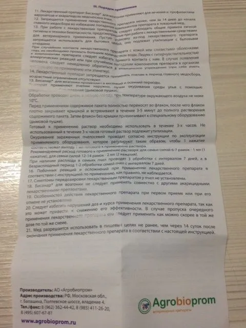 Обработку пчел прекращают за 30 дней до начала главного медосбора во избежание попадания препарата в товарный мед.