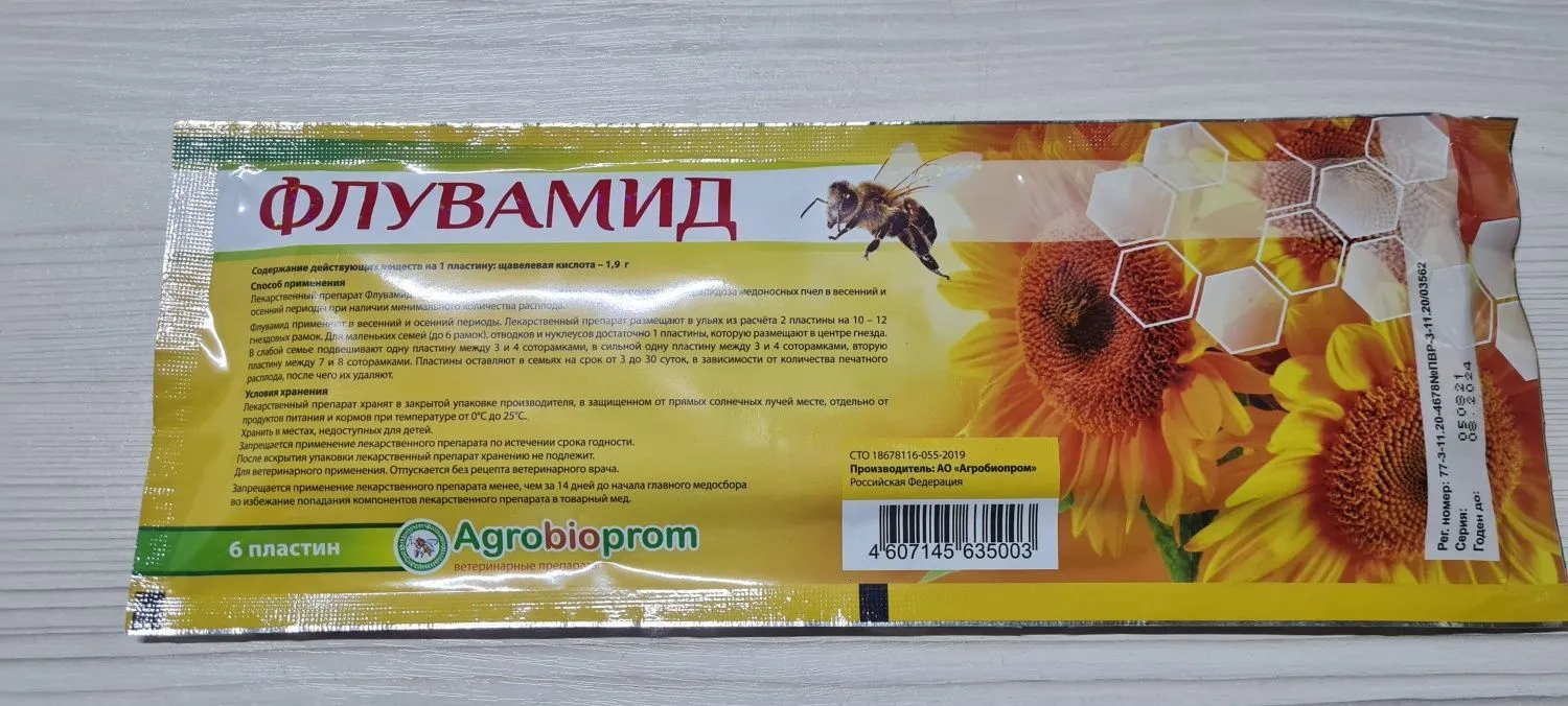 Особые указания: Открывать упаковку только перед обработкой пчел. Запрещается применение лекарственного препарата менее, чем за 14 дней до начала главного медосбора во избежание попадания