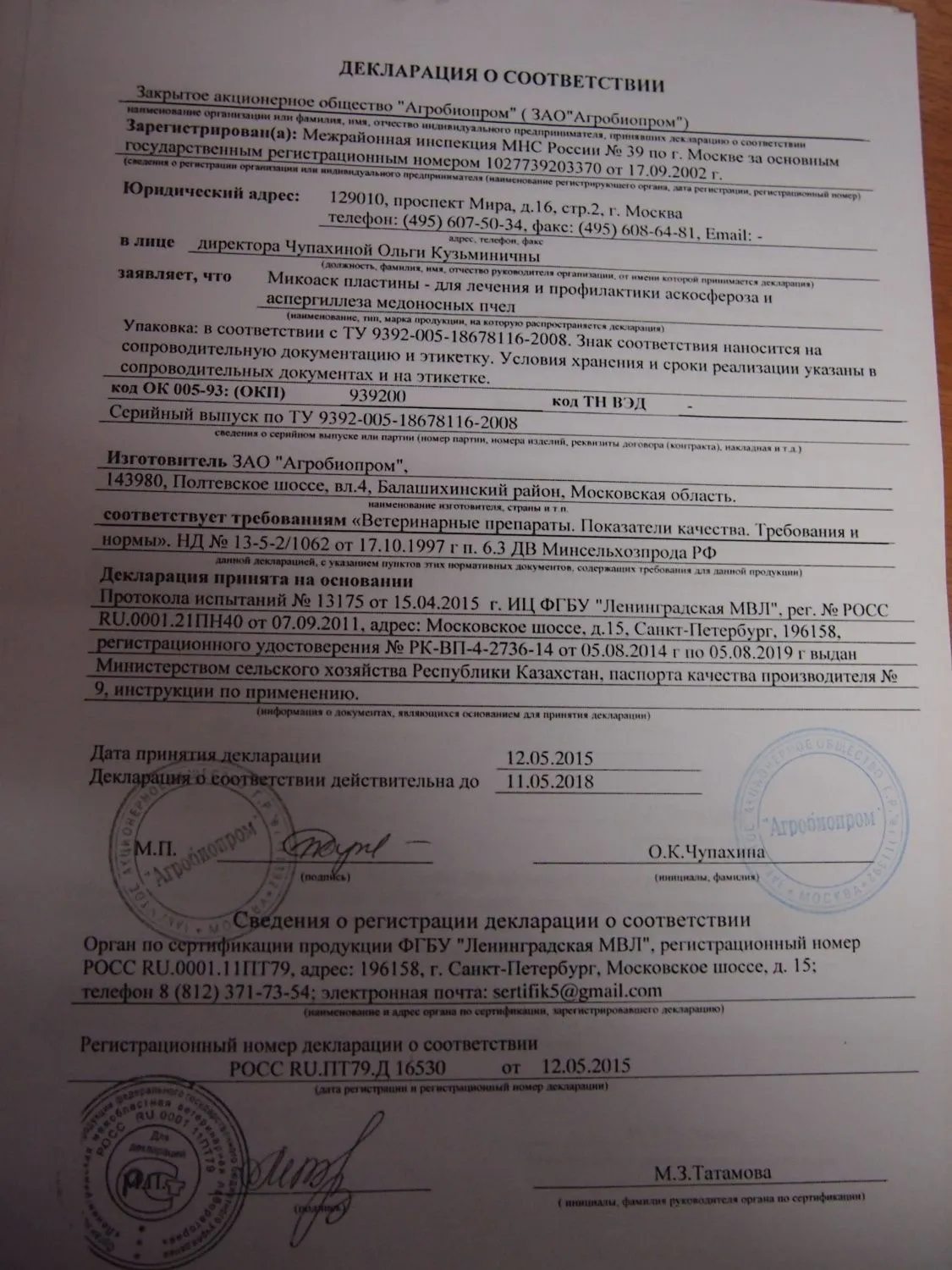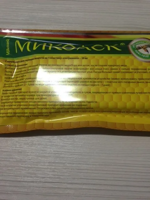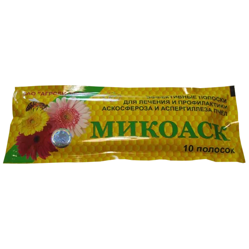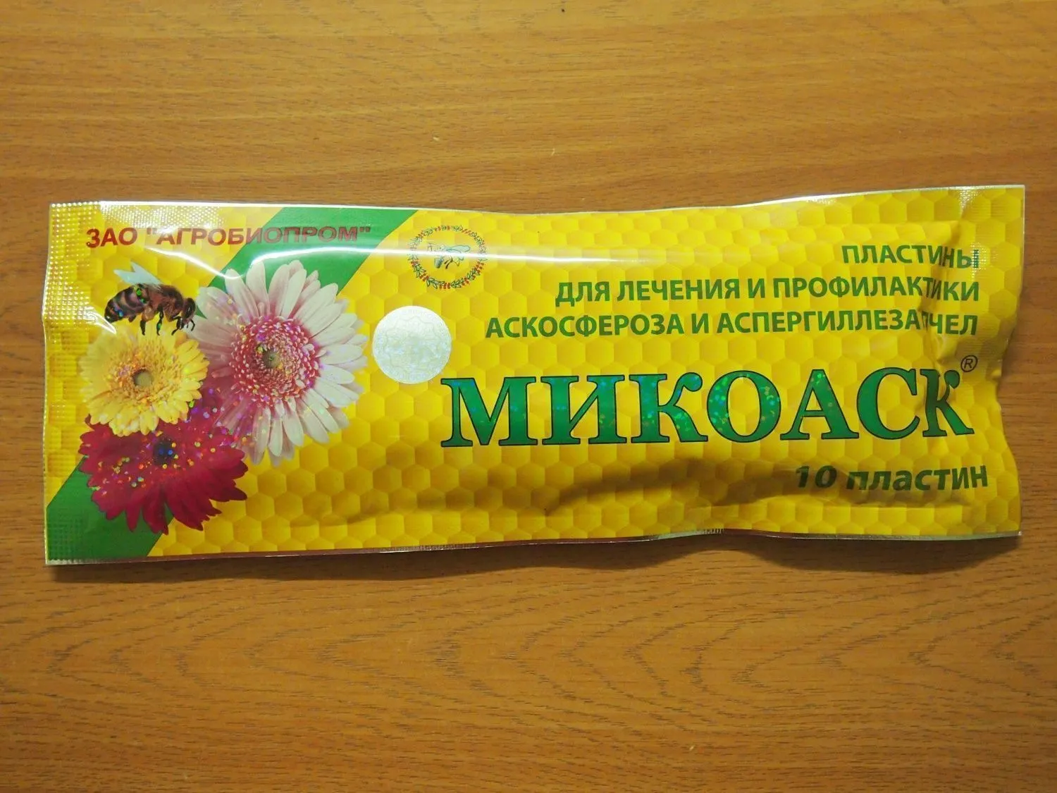 Пластины Микоаска используют для обработки пчел в весенний период (до основного медосбора) или летом после откачки товарного меда помещая их на специальном крепежном устройстве (можно использовать проволоку для наращивания рамок) в улочку между рамкой с расплодом и следующей (кроющей) рамкой из расчета – 1 полоска на 6 гнездовых рамок, занятых пчелами. Обработку проводят 2 раза по мере удаления пчелами полосок из гнезда (через 6 – 7 дней). Одновременно проводят дезинфекцию освобожденных рамок и пчеловодного инвентаря одним из разрешенных к применению дезинфектантов. Подмор и ульевой мусор собирают и сжигают. Обработку семей пчел прекращают не позднее, чем за две недели до начала главного медосбора во избежание попадания препарата в товарный мёд.