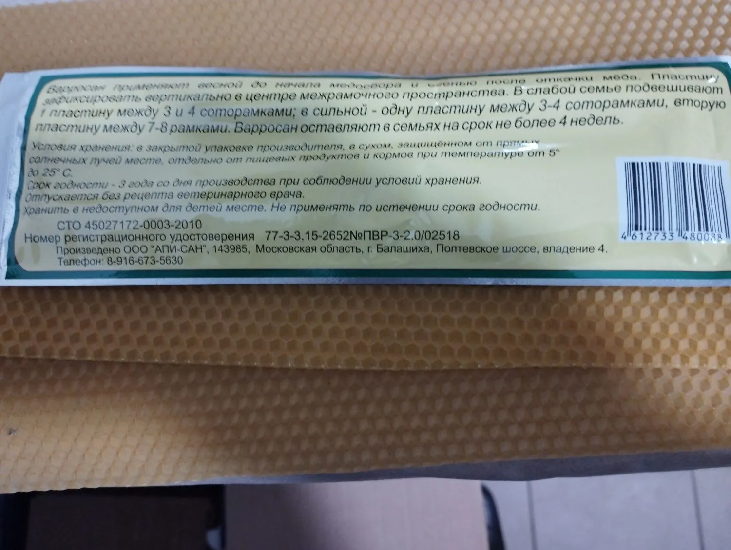 Полоски из древесного шпона, пропитанные специфическим акарицидом. Упаковка 10 полосок в герметично закрытых полимерных фольгированных пакетах.